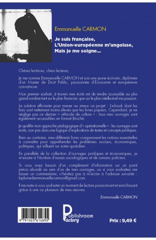 Je me nomme Emmanuelle CARMON et je suis une jeune écrivain, diplômée d'un Master de Droit Public, passionnées d'Economie et européenne convaincue.