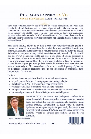 Jean Marc VIDAL, auteur de ce livre, a vécu une expérience unique qui lui a permis de découvrir le merveilleux de cet état dans son quotidien durant trois années. La profonde souffrance qu’il a ressentie lorsqu’il en a été coupé l’a poussé à chercher et comprendre ce qui s’était passé et comment y revenir . Il a découvert que cela n’avait été rendu possible que grâce à une pleine et entière connexion à son âme ainsi qu’une absence totale de son mental, de ses émotions, de ses peurs et de ses croyances. Aujourd’hui, il vit à nouveau cet état de « Tout est possible ». Il vous dévoile la pratique ADA qui lui a permis de retrouver cette connexion qui vous permettra d’y accéder vous-même et de vivre cet éveil. Il partage également de nombreux exemples pratiques, tirés de son expérience et utilisables dans chaque aspect de votre vie. Ce livre