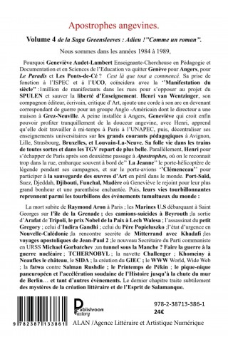Pourquoi Geneviève Audet-Lambert Enseignante-Chercheuse en Pédagogie et Documentation et en Sciences de l'Education va quitter Genève pour Angers, pour Le Paradis et Les Ponts-de-Cé ? C’est là que tout a commencé. Sa prise de fonction à l'ISPEC et à l'UCO, coïncidera avec la "Manifestation du siècle" : l million de manifestants dans les rues pour s'opposer au projet du SPULEN et sauver la liberté d'Enseignement. Henri van Wentzinger, son compagnon éditeur, écrivain, critique d'Art, ajoute une corde à son arc en devenant correspondant de guerre pour un groupe Anglo -Américain dont le directeur a une maison à Grez-Neuville. A peine installée à Angers, Geneviève qui croit enfin pouvoir profiter tranquillement de la douceur angevine, avec Henri, apprend qu'elle doit travailler à mi-temps à Paris à 1'UNAPEC, puis, décentraliser ses enseignements universitaires sur les grands courants pédagogiques à Avignon, Lille, Strasbourg, Bruxelles, et Louvain-La-Neuve. Sa folle vie dans les trains de toutes sortes et dans les TGV repart de plus belle. Parallèlement, Henri pour s'échapper de Paris après son deuxième passage à Apostrophes, où on le reconnait trop dans la rue, embarque souvent à bord de" La Jeanne" le porte-hélicoptère de légende pendant ses campagnes, et sur le porte-avions "Clémenceau" pour participer à la sauvegarde des oeuvres d'Art en péril dans le monde. Port-Saïd, Suez, Djeddah, Djibouti, Funchal, Madère où Geneviève le rejoint pour leur plus grand bonheur et une parenthèse enchantée. Puis, leurs vies tourbillonnantes reprennent parmi les tourbillons des événements tumultueux du monde :