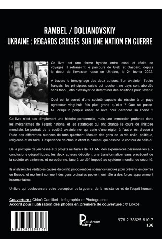 Ce livre est une forme hybride entre essai et récits de voyages. Il retranscrit le parcours de Gleb et Gaspard, depuis le début de l'invasion russe en Ukraine, le 24 février 2022. A travers le témoignage des deux auteurs, l'un ukrainien, l'autre français, les principaux sujets qui touchent ce pays sont abordés sans tabou, afin d'essayer de déterminer des solutions pour l'avenir. Quel est le secret d'une société capable de résister à un pays agresseur vingt-huit fois plus grand qu'elle ? Que se passe-t-il lorsqu'un peuple entier se lève pour défendre sa liberté? Ce livre n'est pas simplement une histoire personnelle, mais une immersion profonde dans les mécanismes de l'esprit national et les stratégies qui ont changé le cours de l'histoire mondiale. Le portrait de la société ukrainienne, qui varie d'une région à l'autre, est dressé à l'aide des différentes nuances de tons qu'offrent l'écoute des gens de la vie civile, politique, religieuse et militaire. L'expérience de chacun étant le pinceau qui dessine le contour de celle-ci. De la politique de jeunesse aux projets militaires de l'OTAN, des expériences personnelles aux conclusions géopolitiques, les deux auteurs dévoilent une transformation sans précédent de la société ukrainienne, et européenne, face à ce défi imposé au système mondial de sécurité. Ils analysent les véritables causes du conflit, proposent des scénarios uniques pour prévenir les guerres en Europe, et montrent comment des gens ordinaires peuvent tenir tête à des forces apparemment insurmontables. Un livre qui bouleversera votre perception de la guerre, de la résistance et de l'esprit humain.