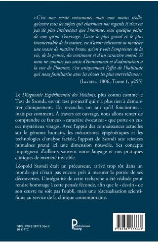 Le Diagnostic Expérimental des Pulsions, plus connu comme le Test de Szondi, est un test projectif qui n’a plus rien à démontrer cliniquement. En revanche, on sait qu’il fonctionne...mais pas comment. À travers cet ouvrage, nous allons tenter de comprendre ce fameux “caractère évocateur” que porte en eux ces mystérieux visages. Avec l'appui des connaissances actuelles sur le génome humain, les mécanismes épigénétiques et les technologies d’analyse faciale, l'apport de Szondi aux sciences humaines prend ici une dimension nouvelle. Ses concepts imprègnent d'ailleurs souvent notre langage et nos pratiques cliniques de manière invisible. Léopold Szondi était un précurseur, arrivé trop tôt dans un monde qui n'était pas encore prêt à mesurer la portée de ses découvertes. L’intégralité de cette recherche a été réalisée pour rendre hommage à cette pensée féconde, afin que le ""destin"" de son œuvre ne soit pas l'oubli, mais une réactualisation scientifique au service de la clinique contemporaine.